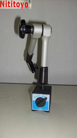 其特点如下: 1.万向支臂,可固定任何角度,使用方便迅速,磁性底座有2--160KG的吸力. 2.夹表处带微调装置,可任意调节方向定位. 3.除可夹持普通百分表,杠杆表外,还可对带燕尾槽的杠杆百分表夹持.